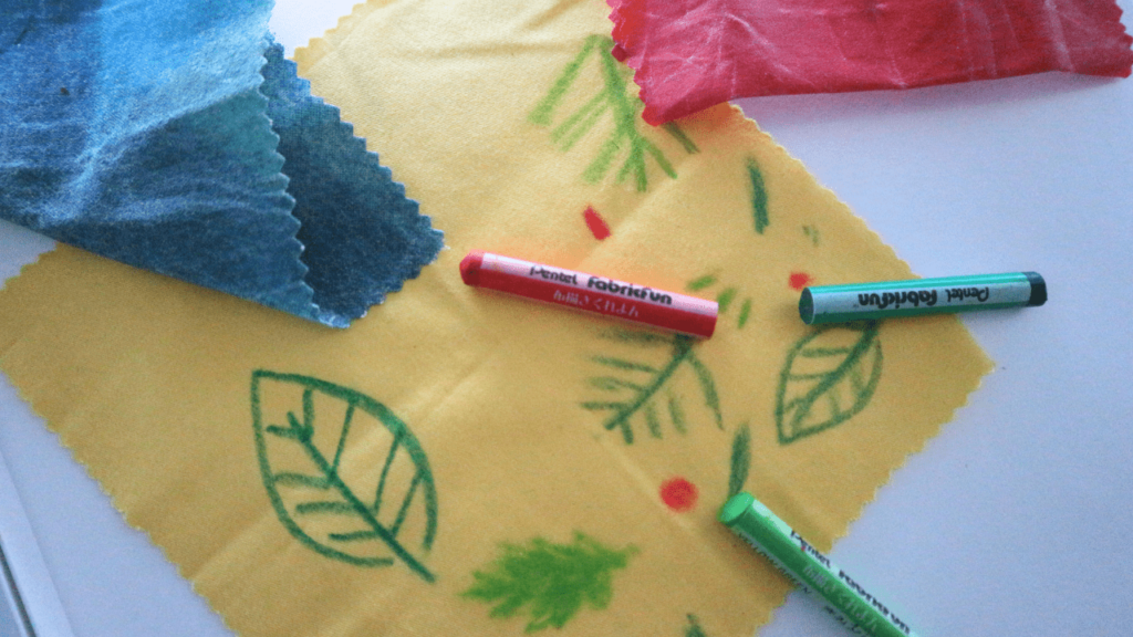 布用クレヨンや布用スタンプを使うと、鮮やかで楽しいデザインに仕上がります。