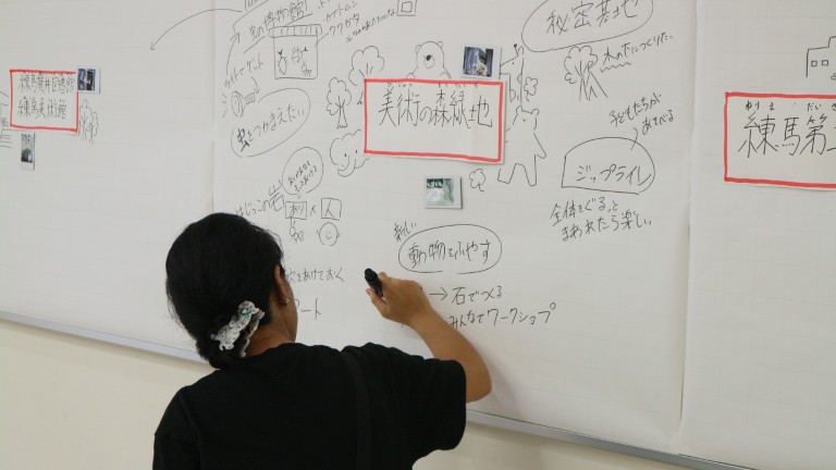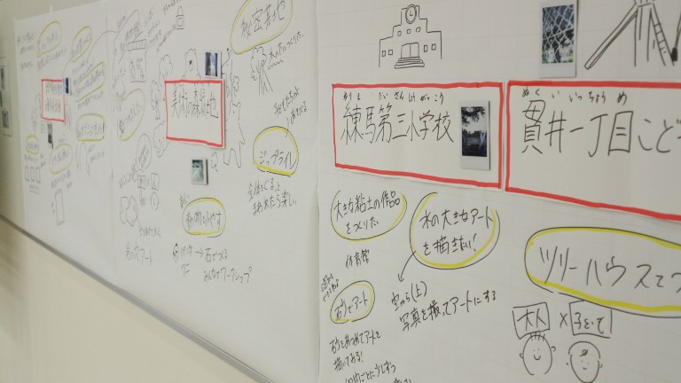 中村橋駅の階段をキャンバスに見立て、大人と子どもが協力してアートを完成させる階段アートの企画や、オリジナルの「練馬区カード」を作成して公式グッズやお祭りの参加特典として配布・活用するアイデア、ワークショップで自分の絵本をつくり、完成後に作者本人が読み聞かせをするオリジナル絵本読み聞かせ会…などなど多種多様なアイデアが集まりました。